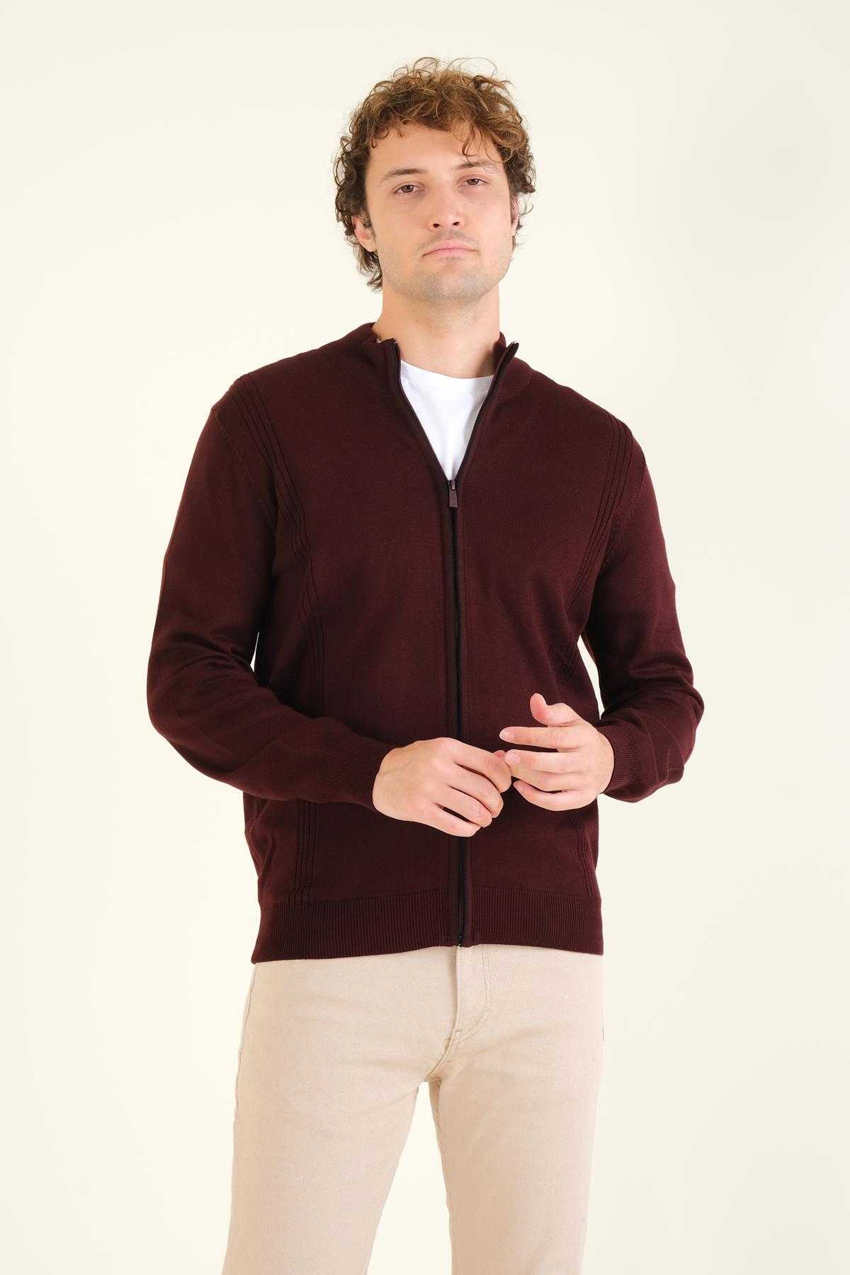 Erkek Biyeli Dik Yaka Fermuarlı Hırka Bordo