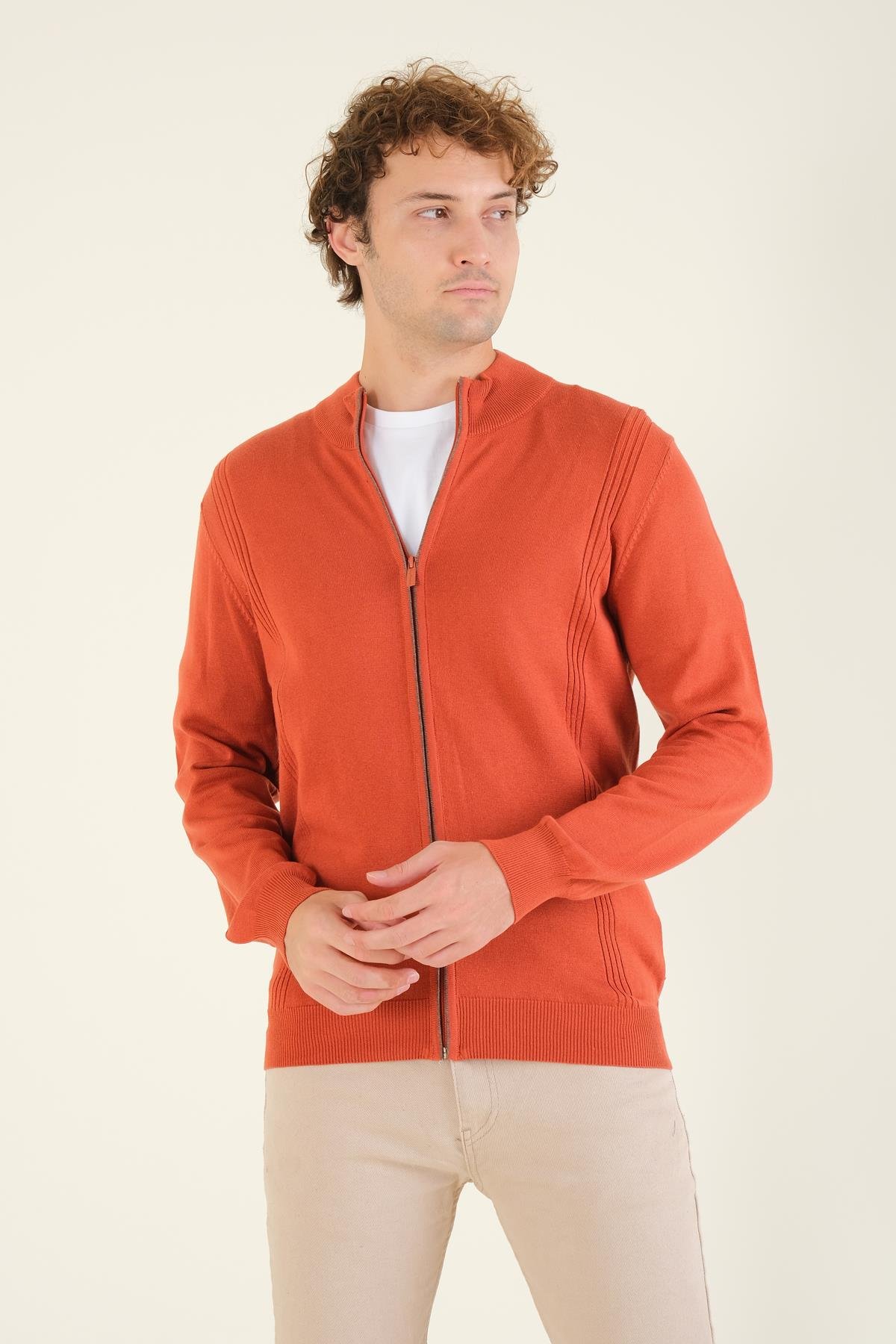 Erkek Biyeli Dik Yaka Fermuarlı Hırka Kiremit