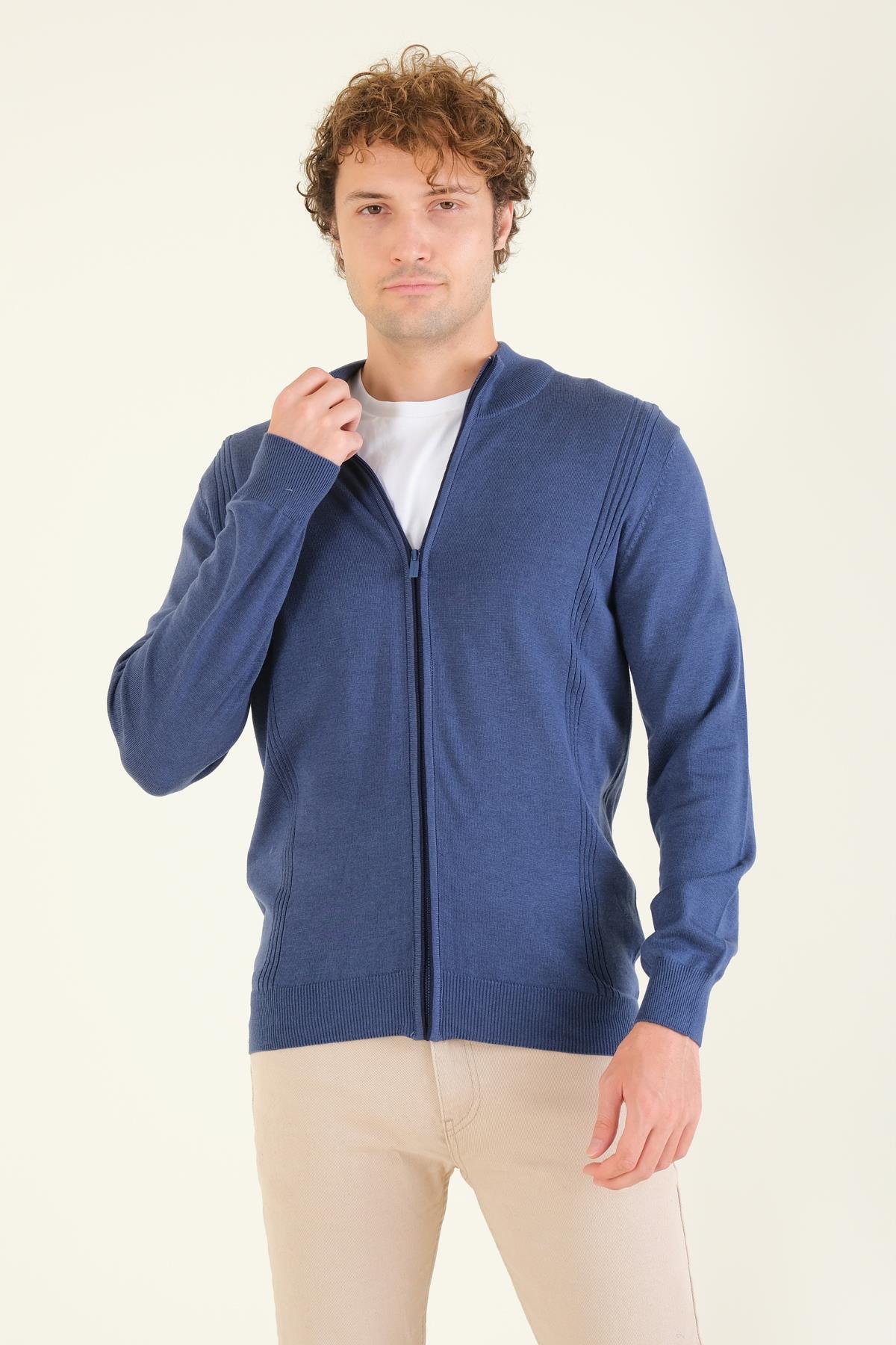 Erkek Biyeli Dik Yaka Fermuarlı Hırka Lacivert