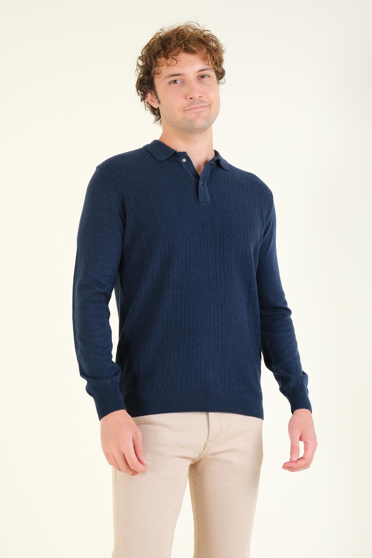 Erkek Desenli Polo Yaka Kazak Petrol Mavi