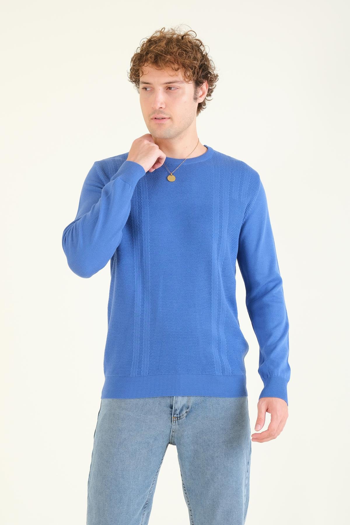 Erkek Desenli Sıfır Yaka Kazak Saks Mavi