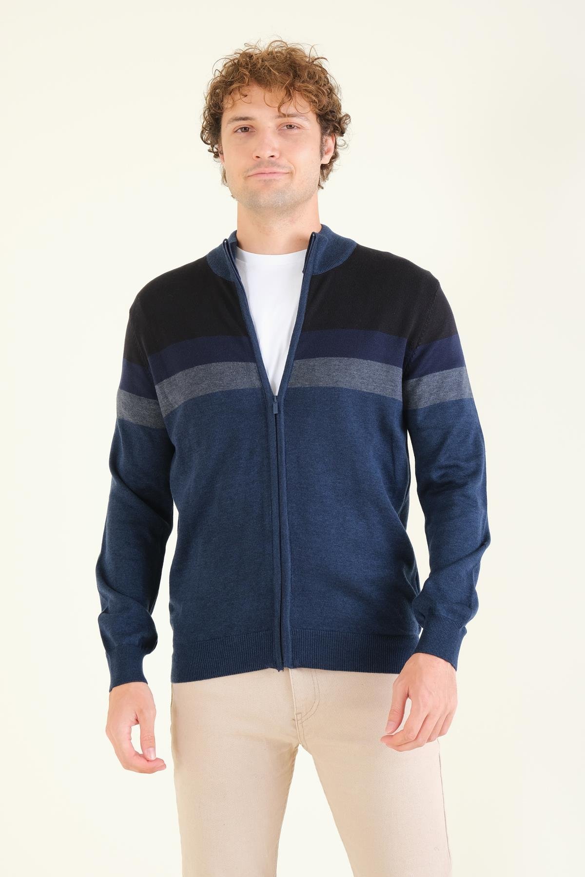 Erkek Dik Yaka Fermuarlı Renki Hırka İndigo