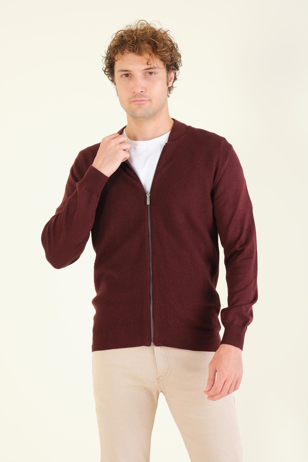 Erkek Hakim Yaka Petek Örgü Fermuarlı Hırka Bordo