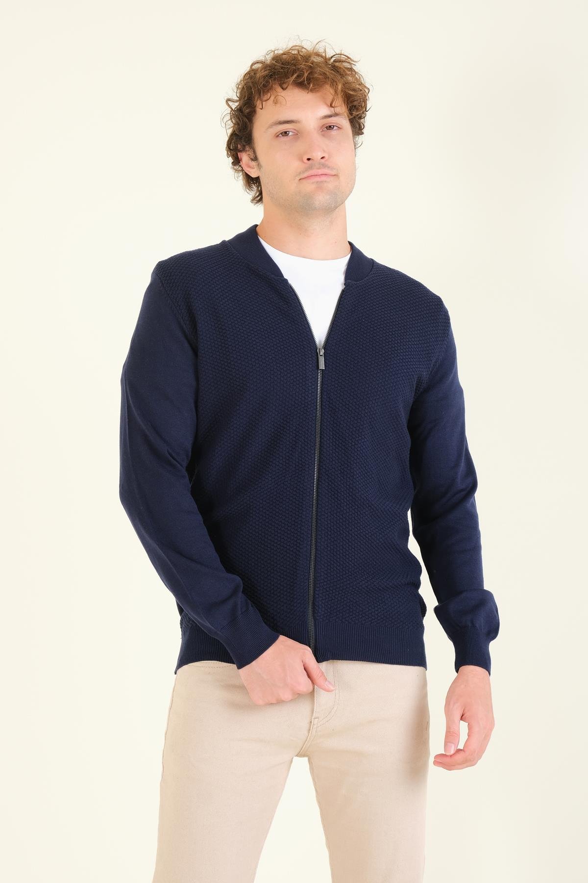 Erkek Hakim Yaka Petek Örgü Fermuarlı Hırka Lacivert