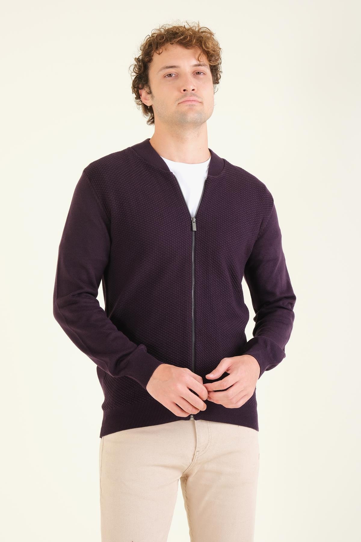 Erkek Hakim Yaka Petek Örgü Fermuarlı Hırka Mor