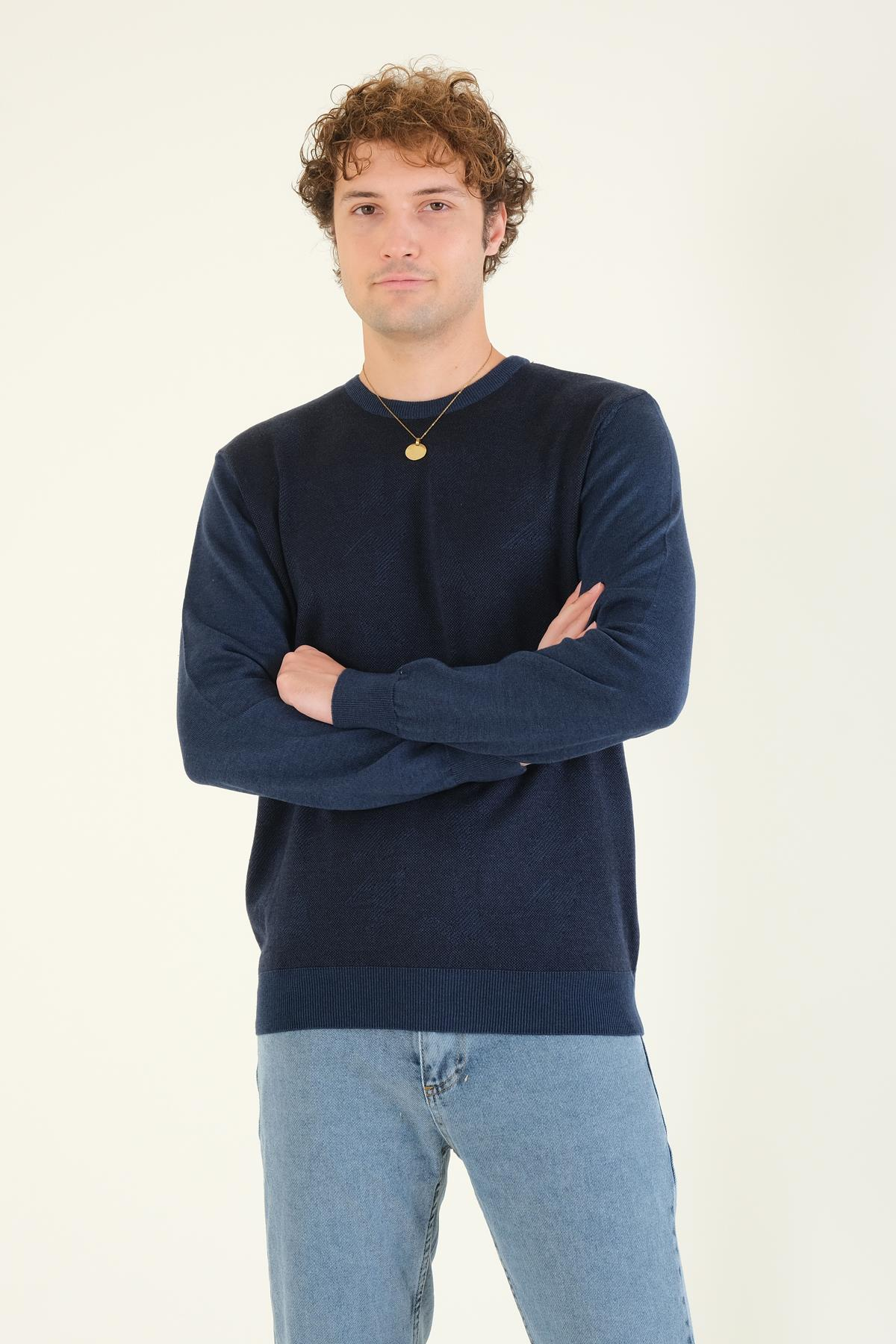Erkek Kendinden Desenli Sıfır Yaka Kazak Koyu Mavi