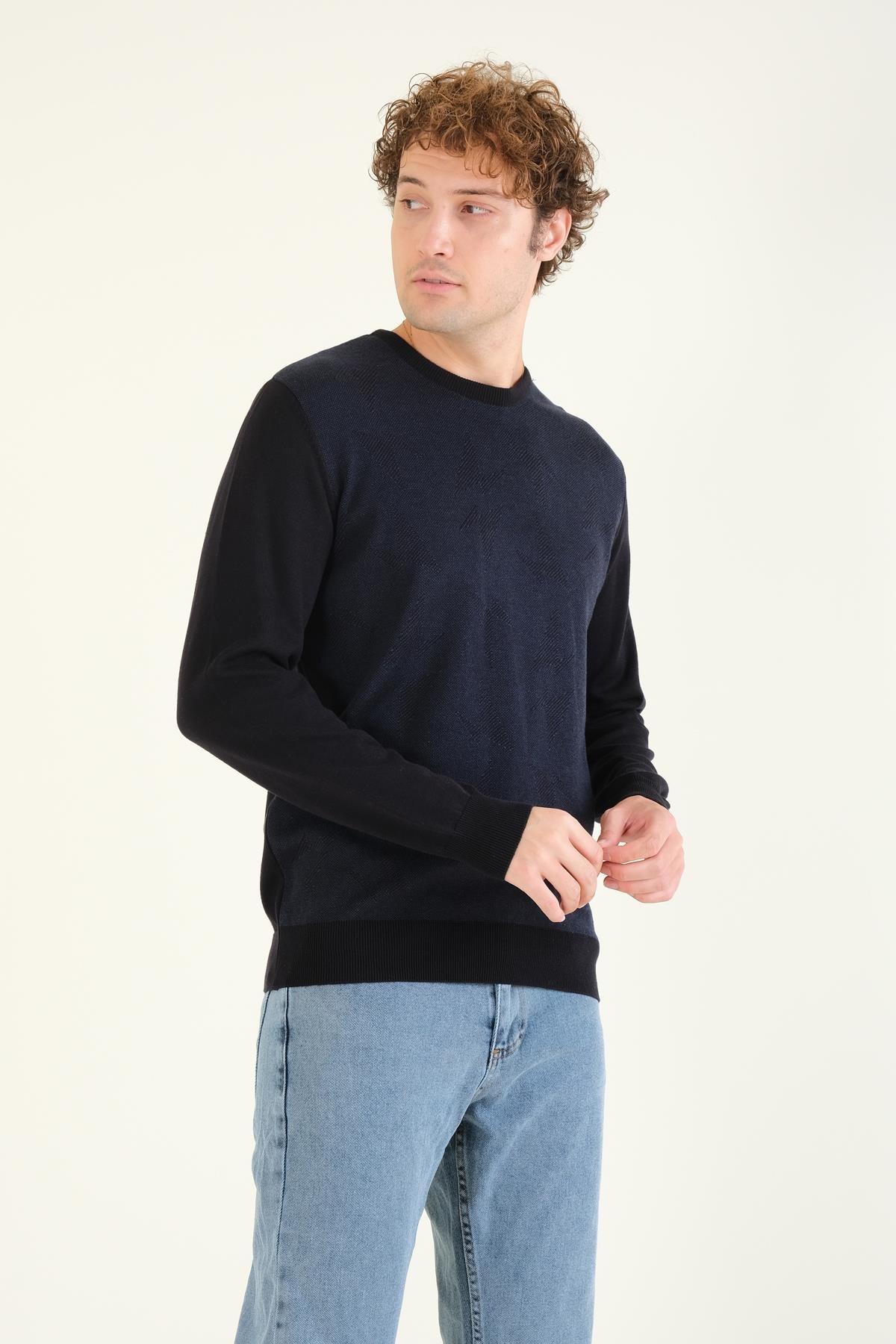 Erkek Kendinden Desenli Sıfır Yaka Kazak Lacivert