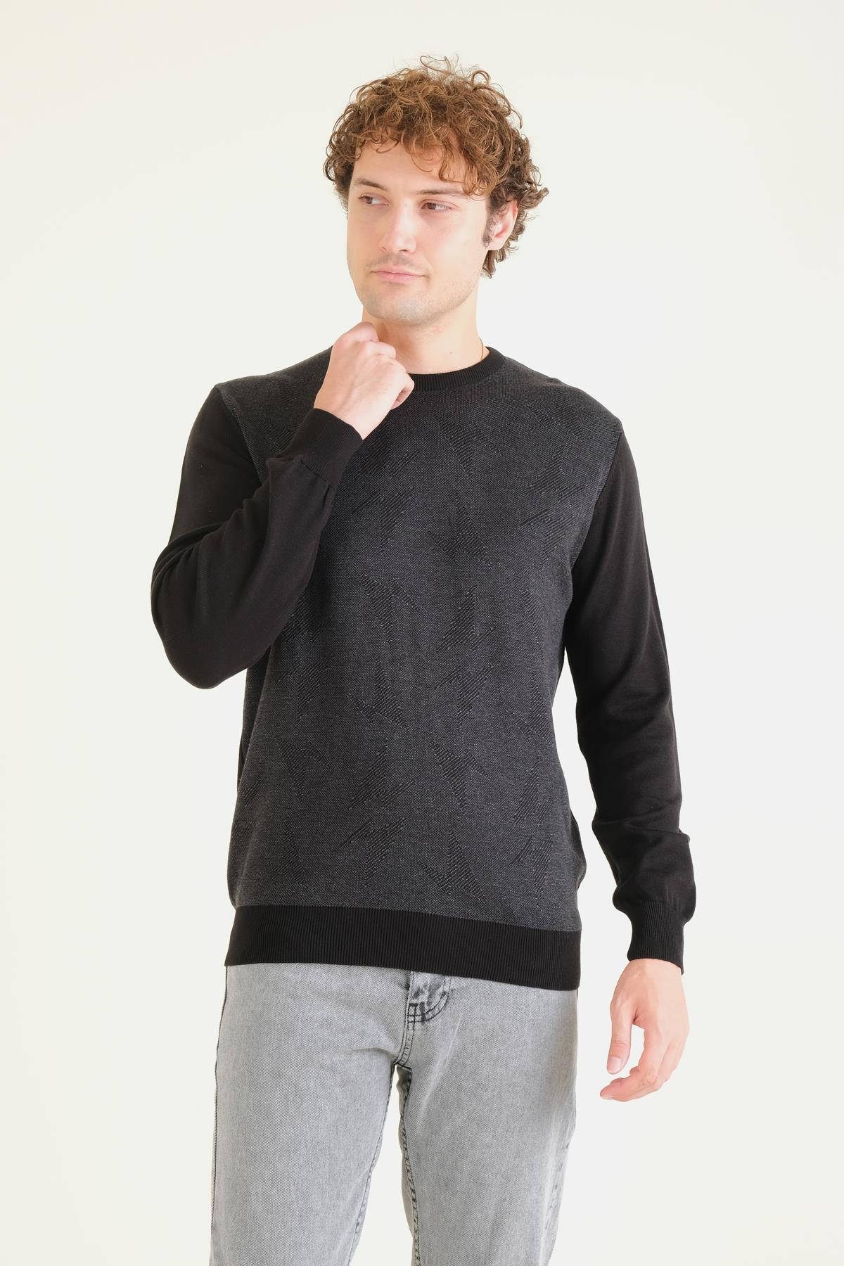 Erkek Kendinden Desenli Sıfır Yaka Kazak Siyah