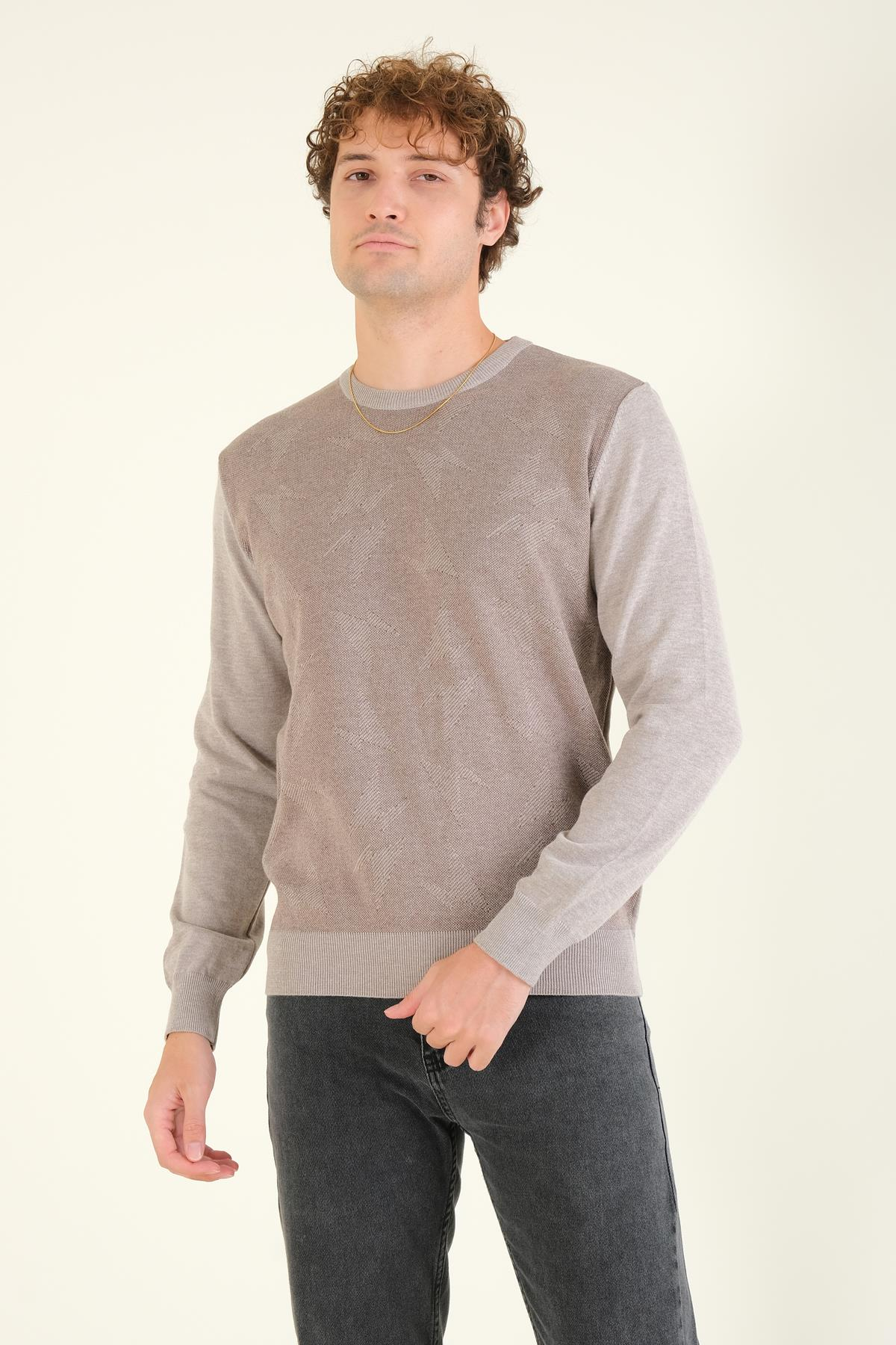 Erkek Kendinden Desenli Sıfır Yaka Kazak Vizon