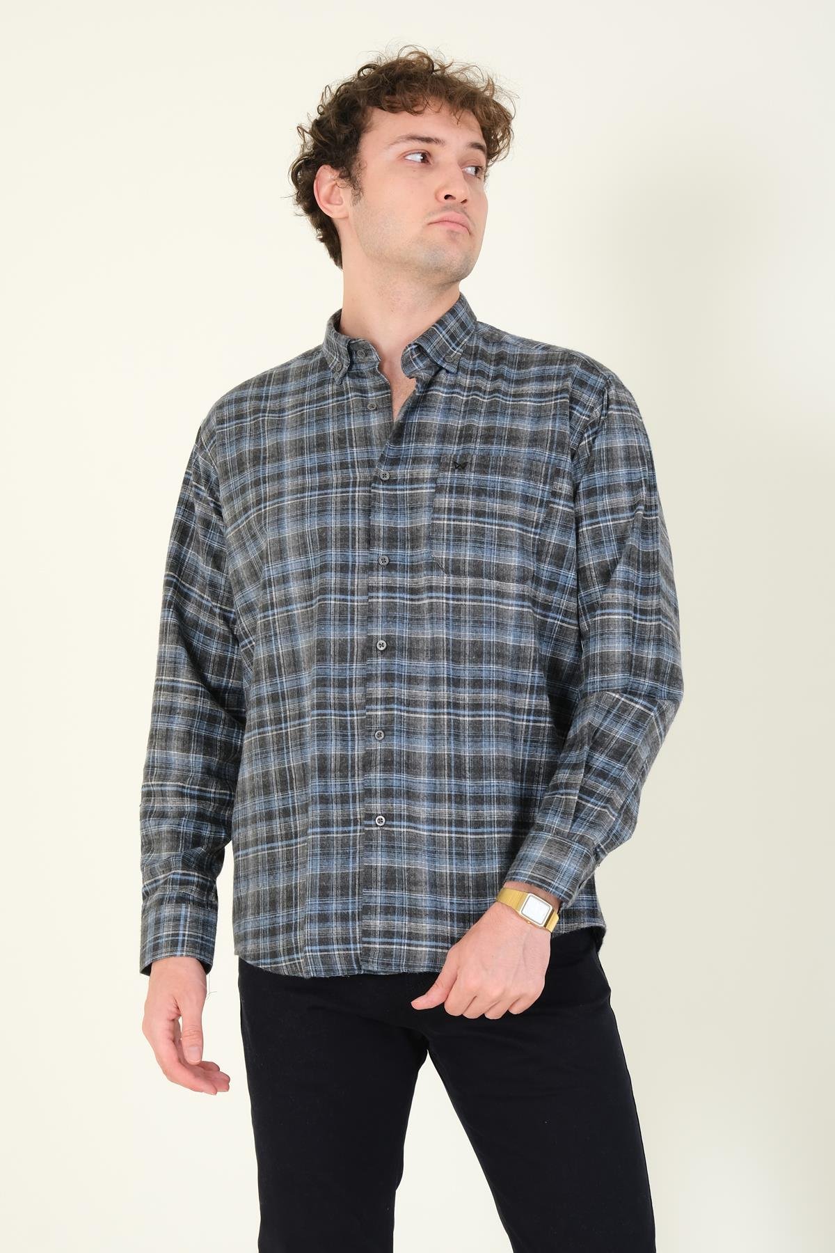 Erkek Tek Cep Ekose Desenli Kışlık Gömlek Füme