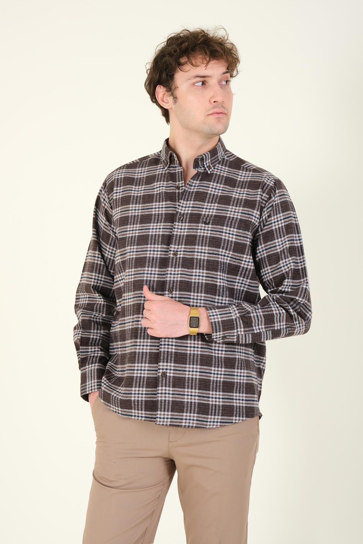 Erkek Tek Cep Ekose Desenli Kışlık Gömlek Kiremit