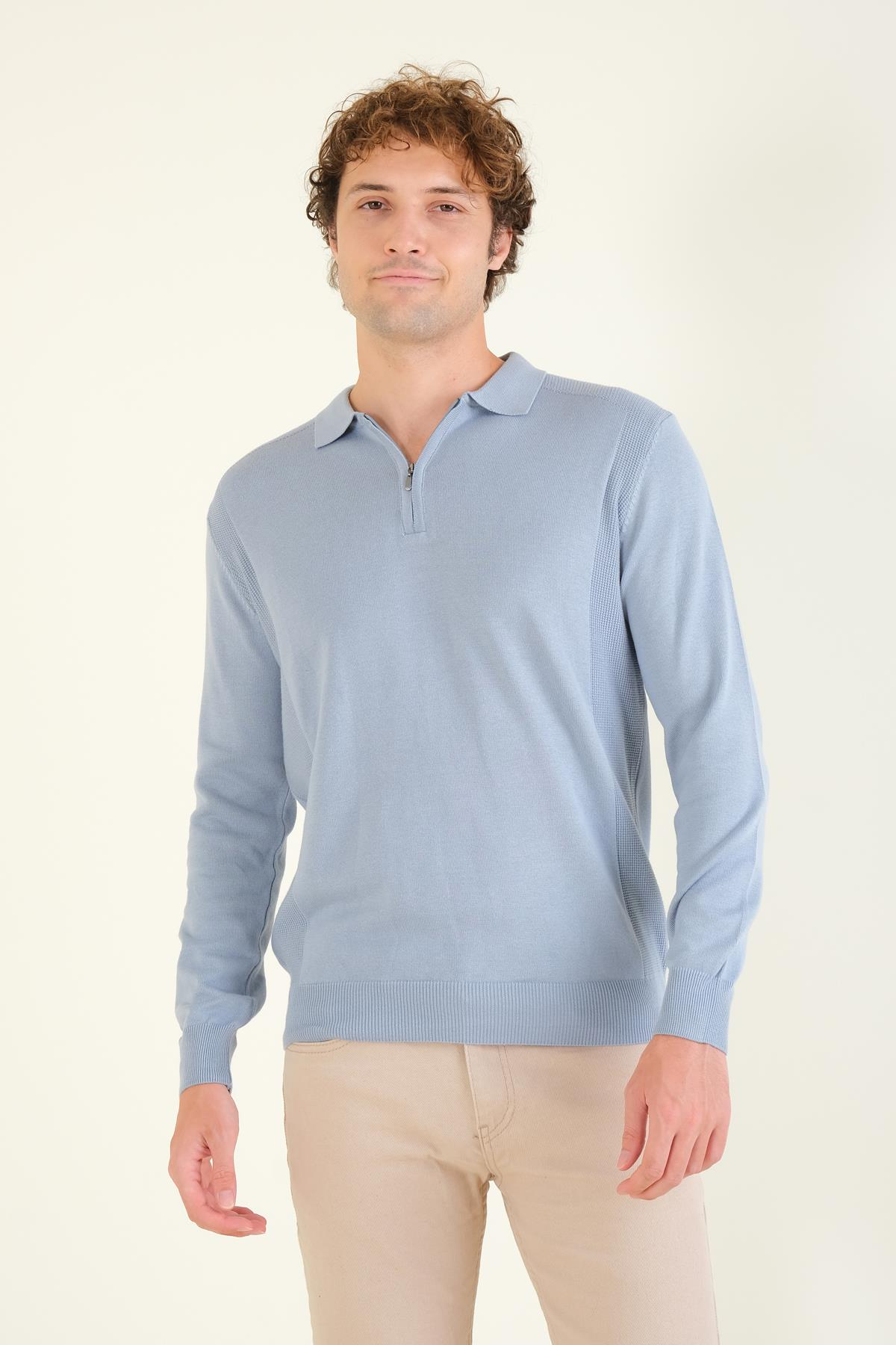 Erkek Yarım Fermuarlı Polo Yaka Kazak Açık Mavi