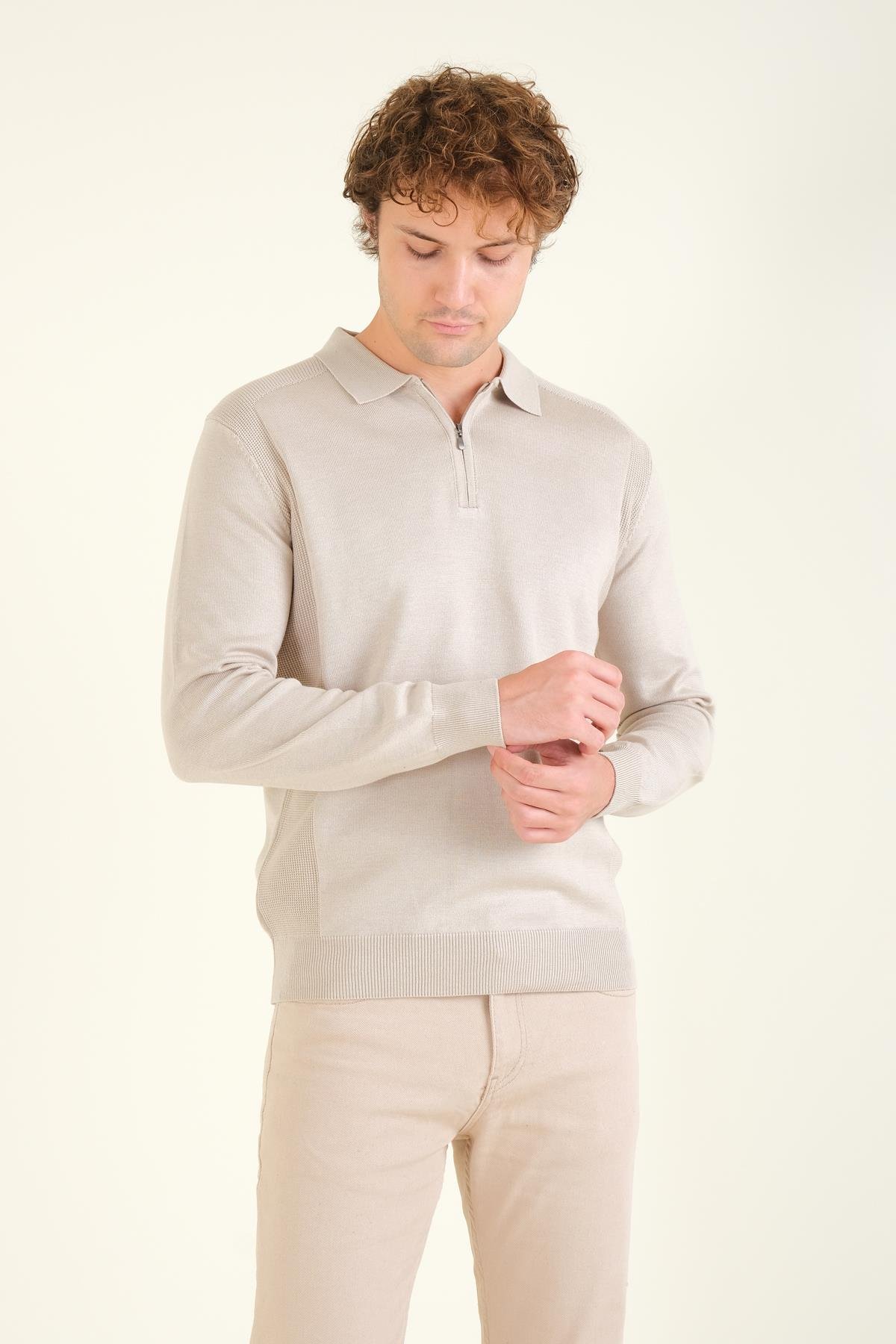Erkek Yarım Fermuarlı Polo Yaka Kazak Taş