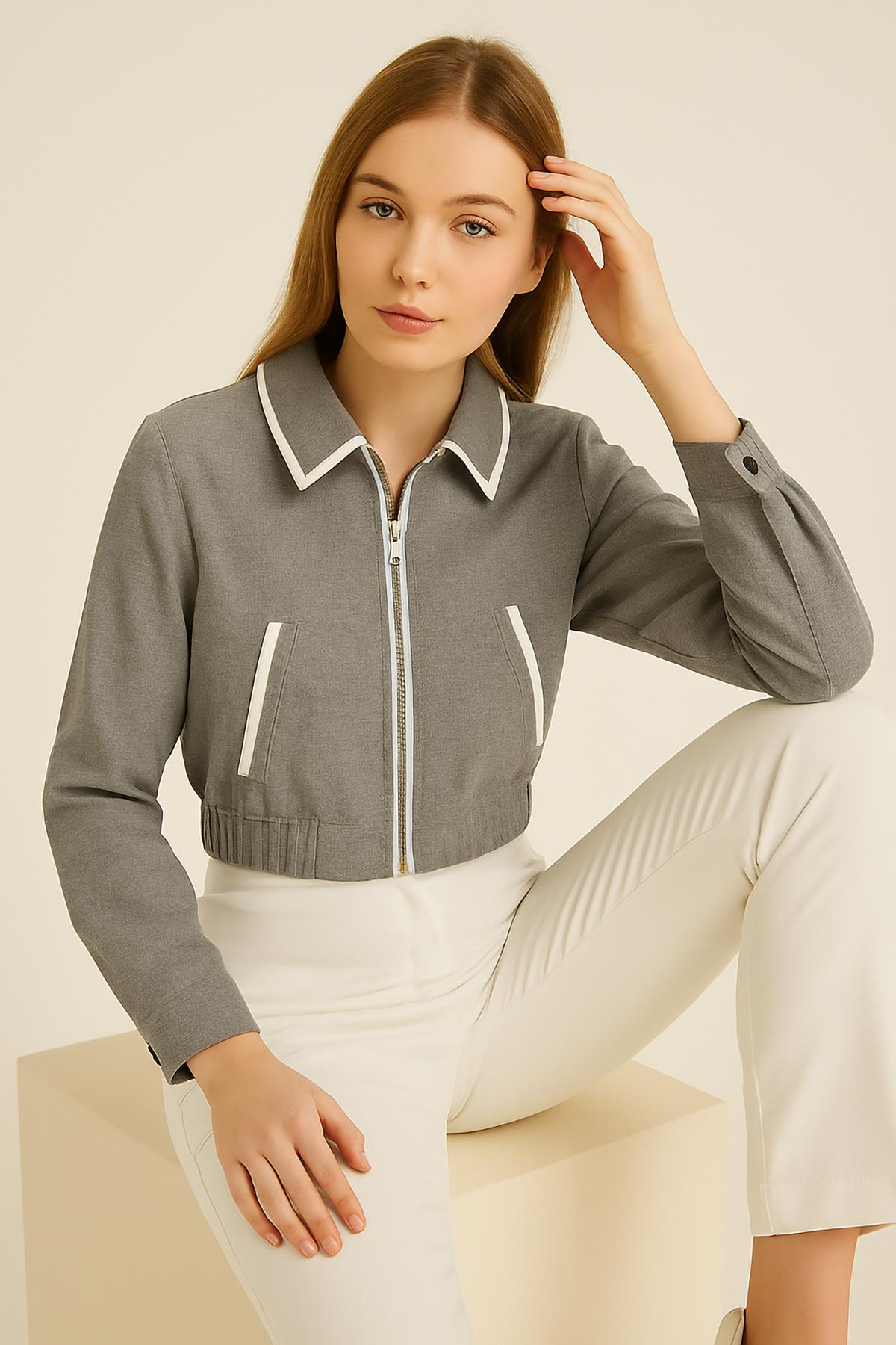 Kadın Biyeli Astarlı Crop Ceket Gri (4420000263537)