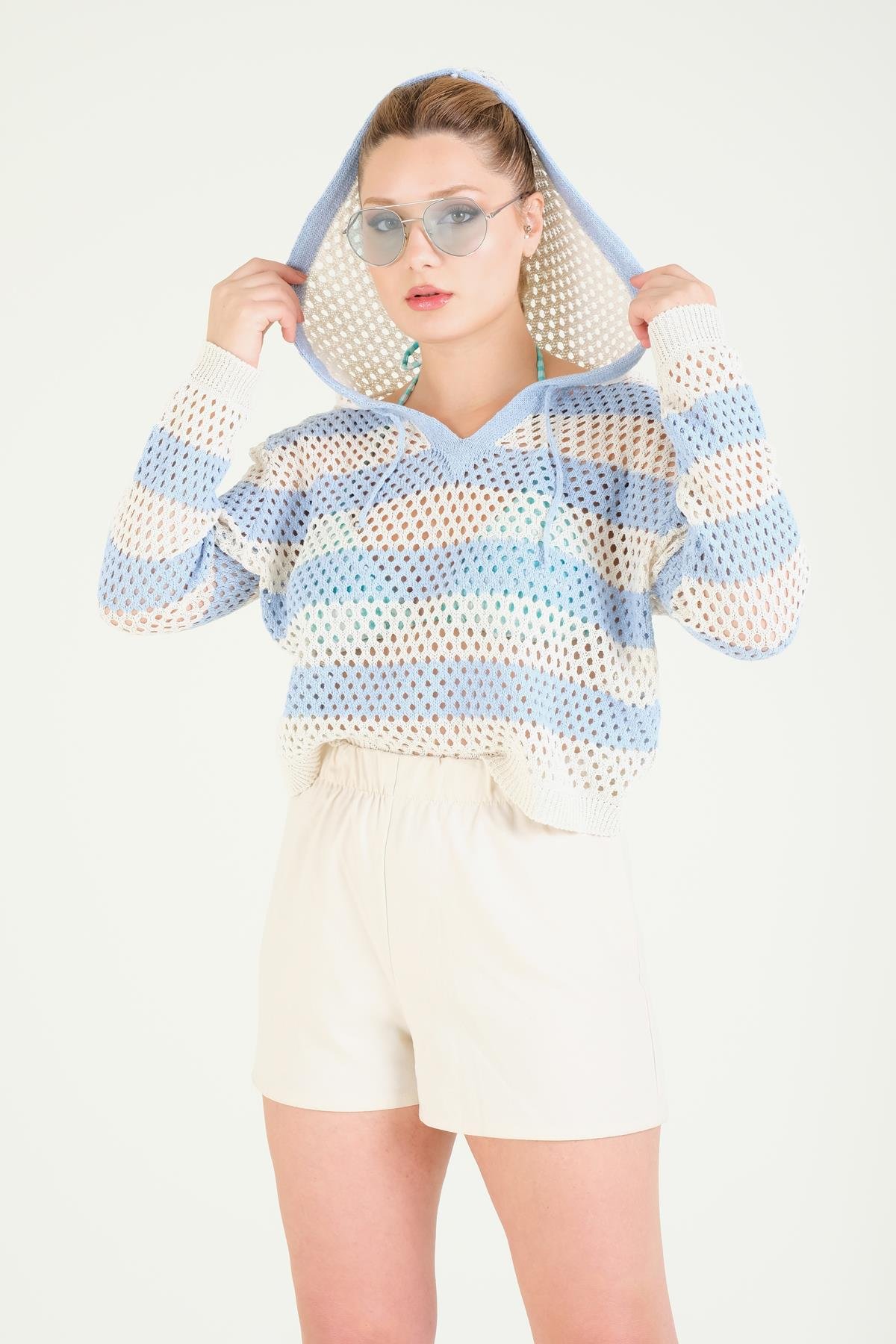 Kadın Kapüşonlu File Bluz Mavi