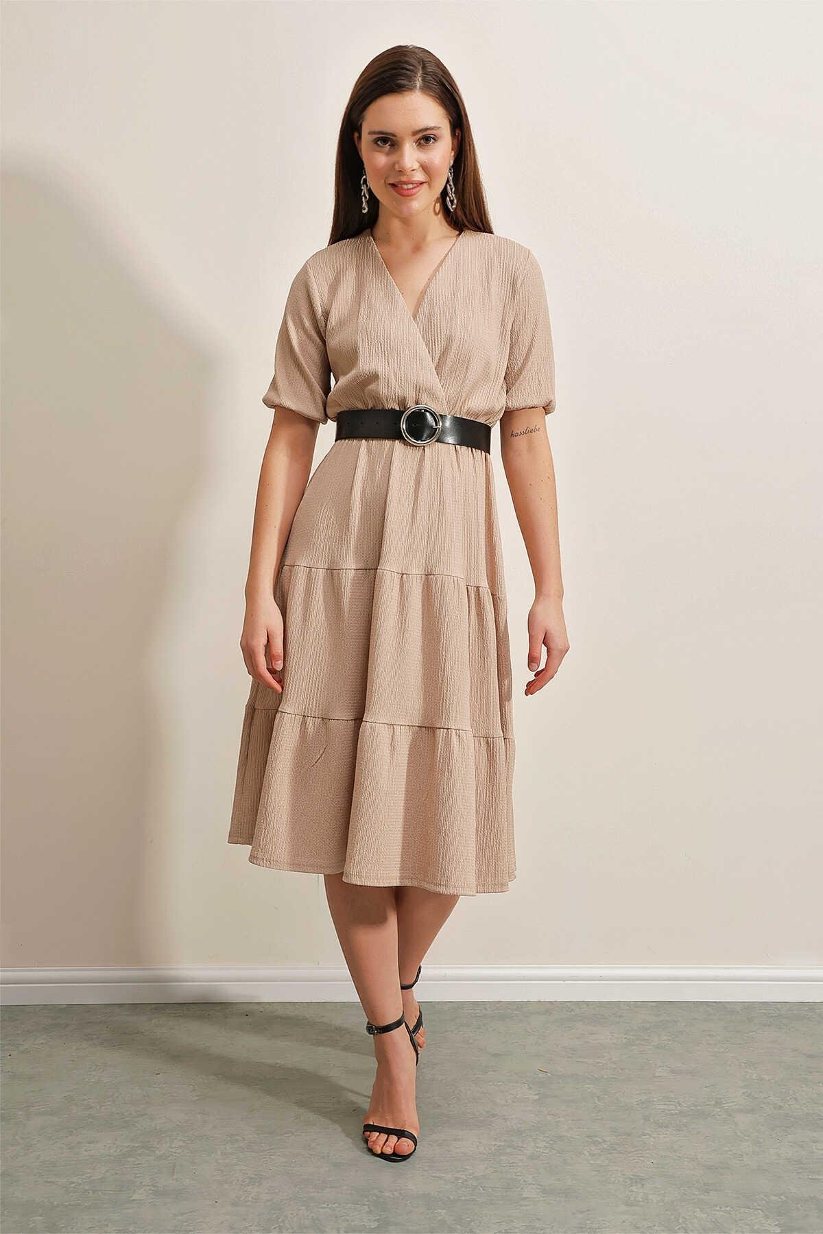 Kadın Kemerli Kruvaze Elbise Vizon (4420000233738)