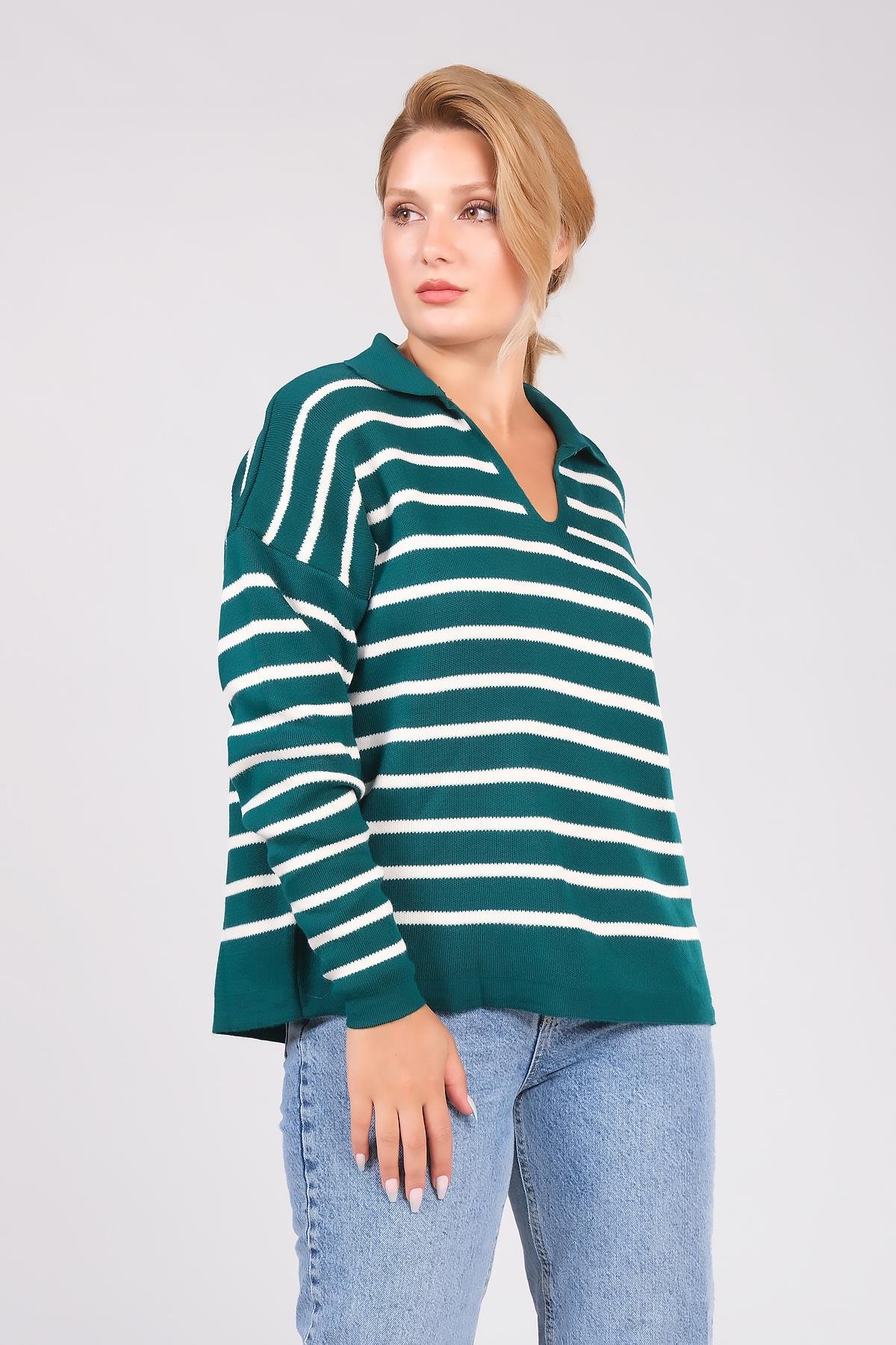 Kadın Polo Yaka İnce Çizgili Triko Kazak Zümrüt (4420000228628)