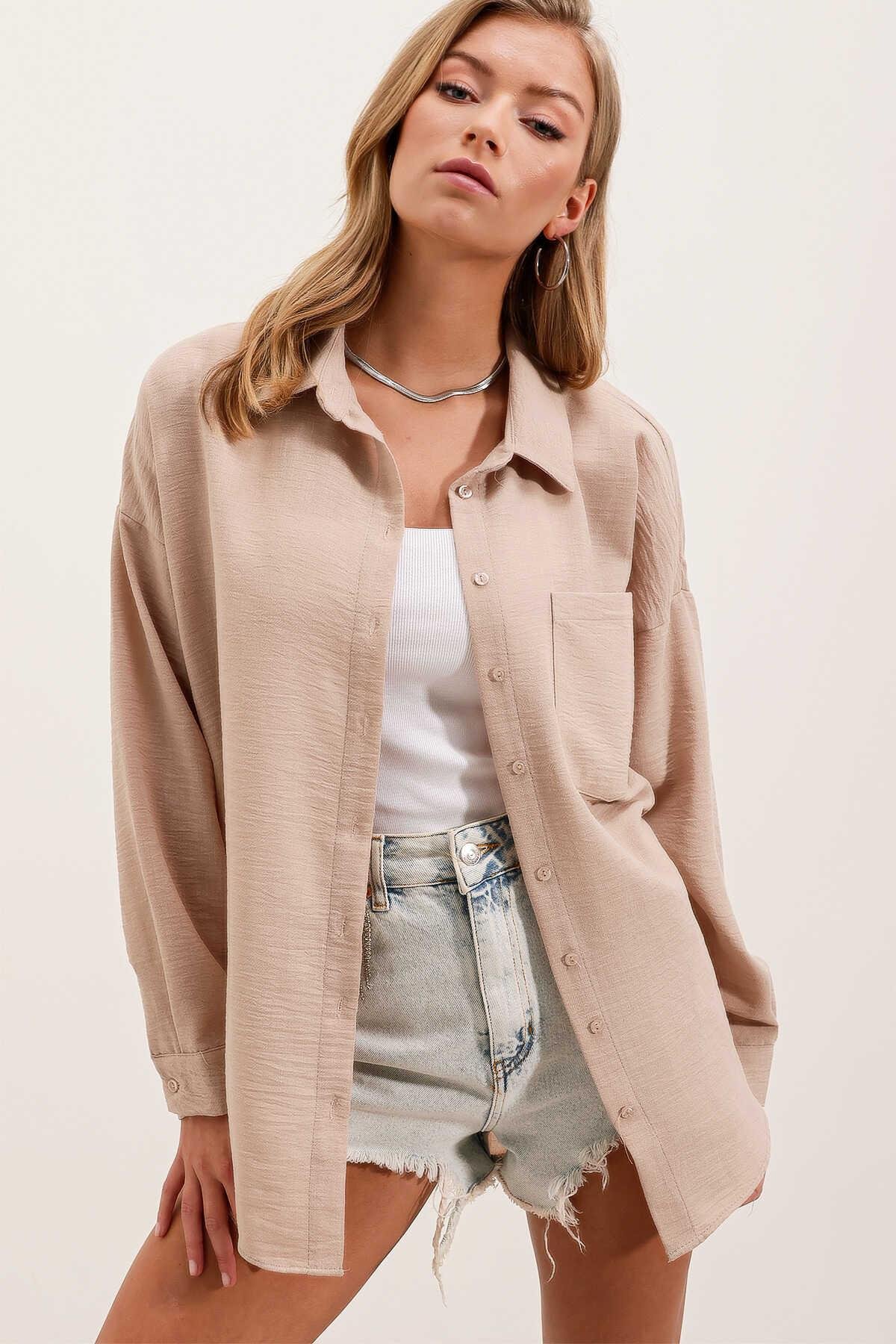 Kadın Tek Cepli Oversize Gömlek Vizon