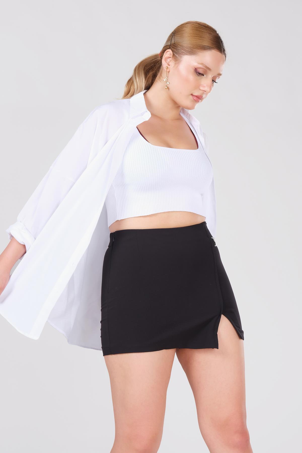 Kadın Yırtmaçlı Bel Toka Detaylı Şort Etek Siyah